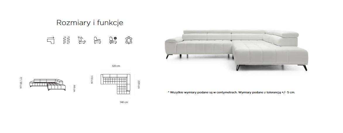 Wymiary narożnika podano z tolerancją wymiarów +/- 5 cm.