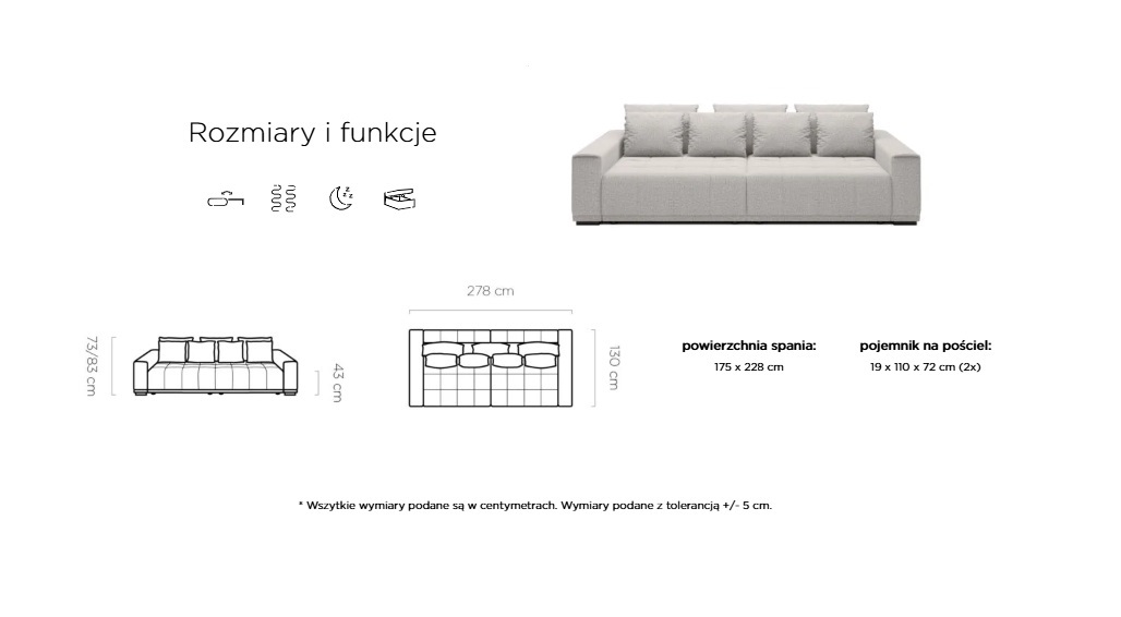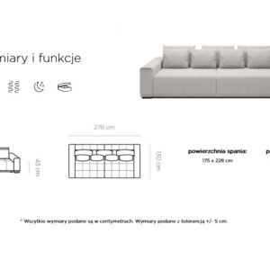 Wymiary sofy podano z tolerancją wymiarów +/- 5 cm.